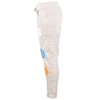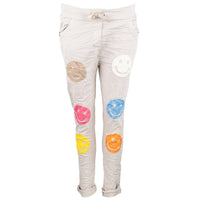 Discover the good mood trousers "Smile" - a pair of white women's jeans with a crumpled fabric look that brings pure joie de vivre. The loose cut and the adjustable waistband, which is conveniently closed with a white drawstring, offer ultimate comfort and flexibility. On the front of the trouser legs there are three colored smileys, which are sewn on as colorful fabric appliqués and give the jeans a cheerful, unique look.